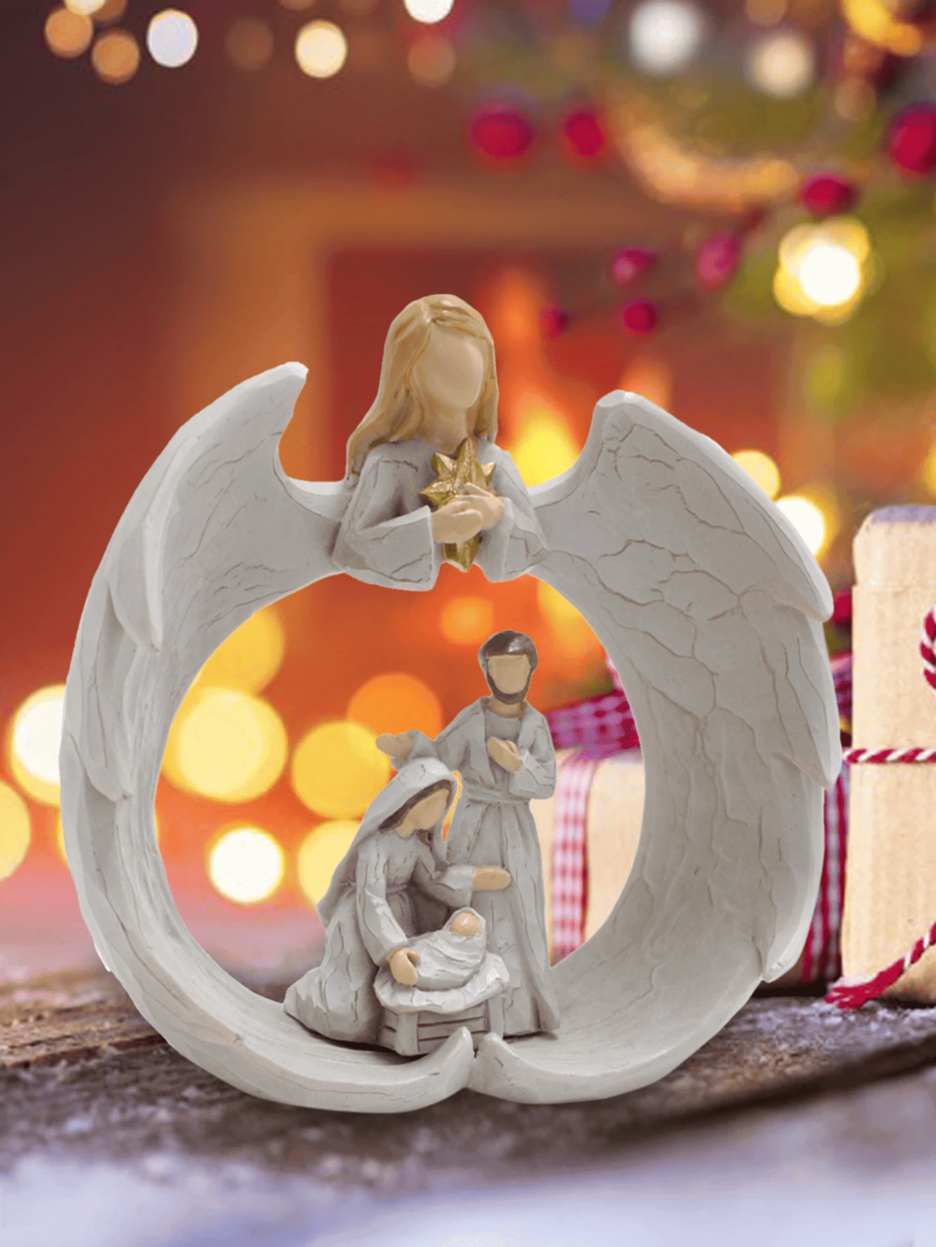 Este delicado adorno, esculpido en resina con finos detalles, representa la protección divina y la presencia constante de lo sagrado en el hogar. Con una expresión serena y brazos abiertos hacia el cielo, la figura simboliza la esperanza, la fe y el amor incondicional.