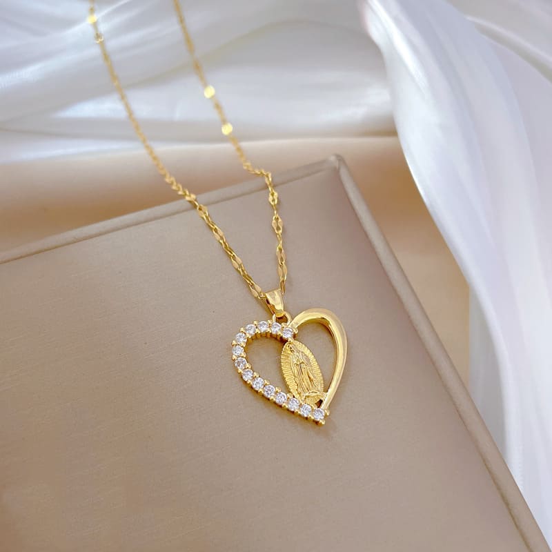 La imagen de Nuestra Señora de Guadalupe en un colgante en forma de corazón transmite protección, amor y cuidado maternal.