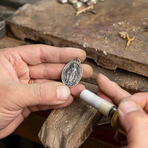 La Medalla Milagrosa es un poderoso símbolo de fe, protección e intercesión divina. Representa a la Bienaventurada Virgen María como Medianera de Todas las Gracias: aplastando la serpiente del mal bajo sus pies, de pie sobre el mundo, con rayos de luz que fluyen de sus manos —la gracia derramada sobre quienes la invocan con fe.