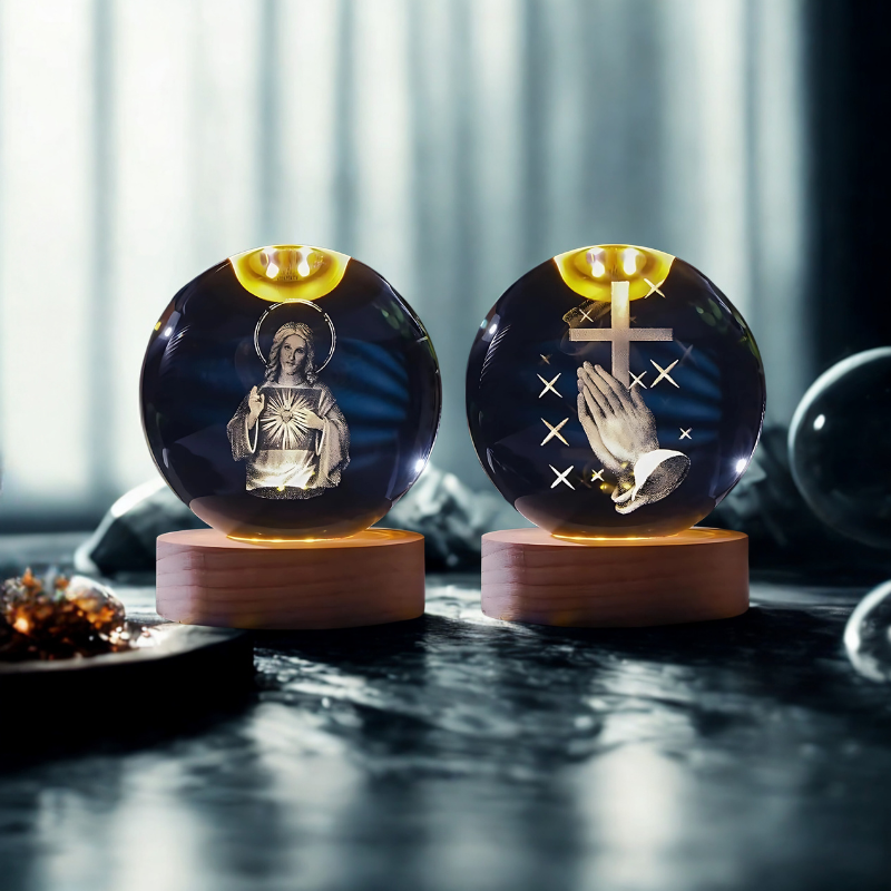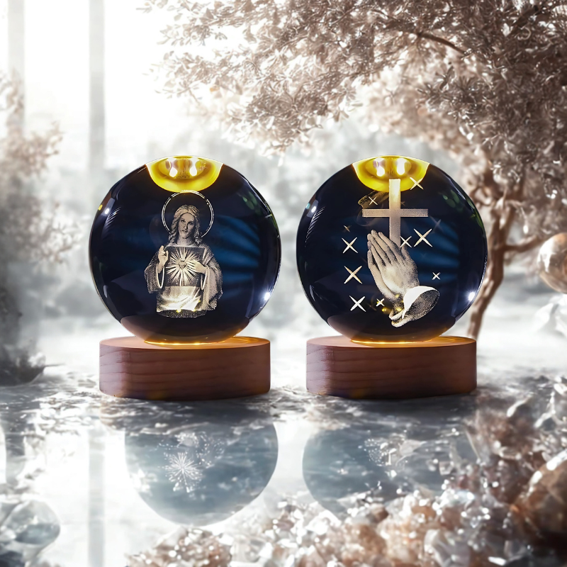Descubre la belleza y la espiritualidad en un solo objeto. Esta lámpara decorativa con esfera de cristal 3D graba imágenes religiosas con precisión láser, iluminadas con una suave luz LED que crea una atmósfera de paz y reflexión. Ideal para colocar en tu dormitorio, sala de oración o regalar en fechas especiales como Navidad o Pascua.