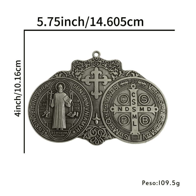 Esta medalla de San Benito presenta un acabado vintage en tono bronce, ideal para colgar en la pared o colocar sobre una mesa o altar.