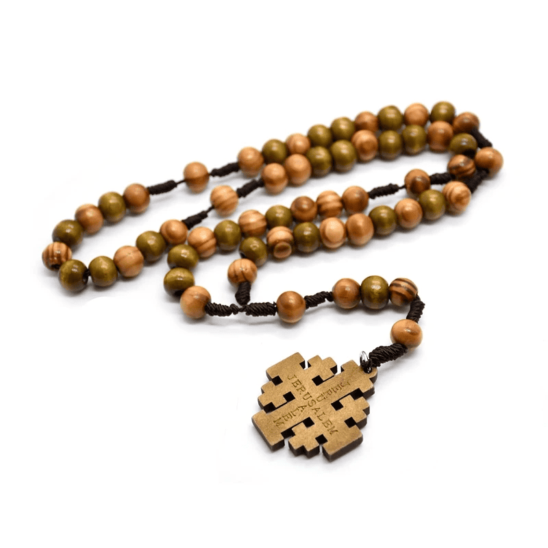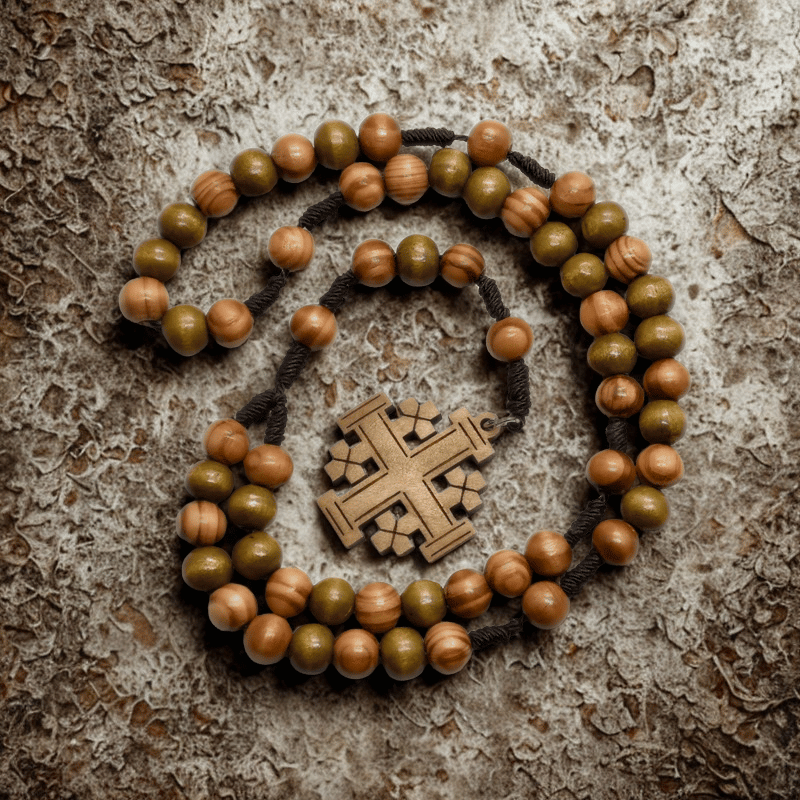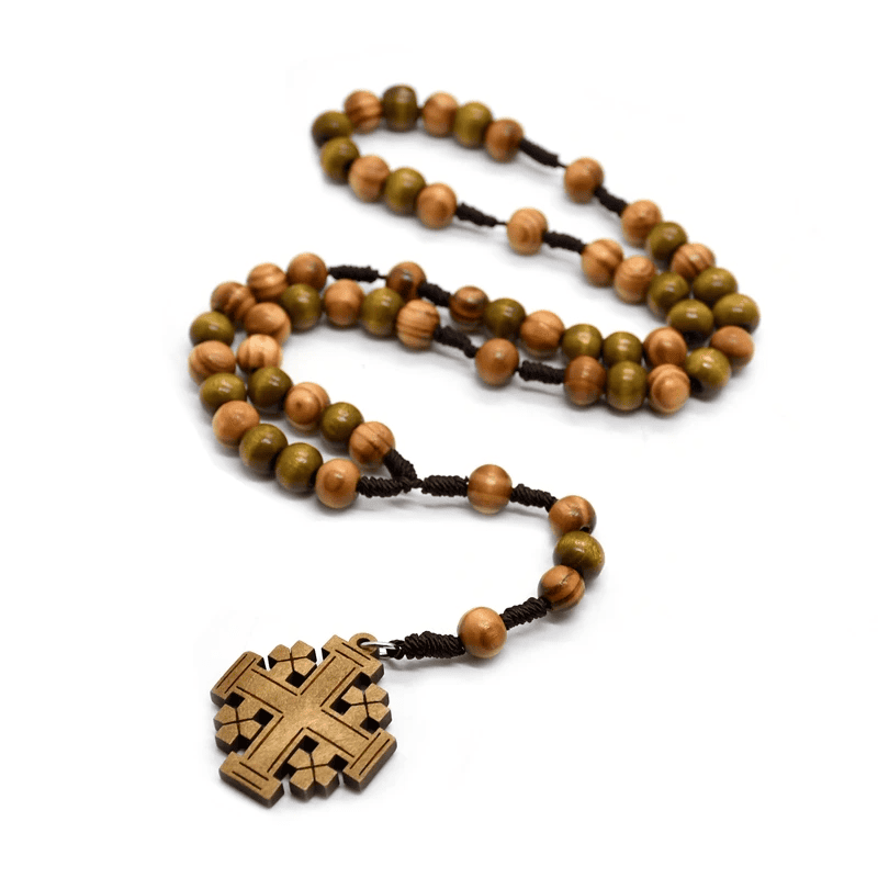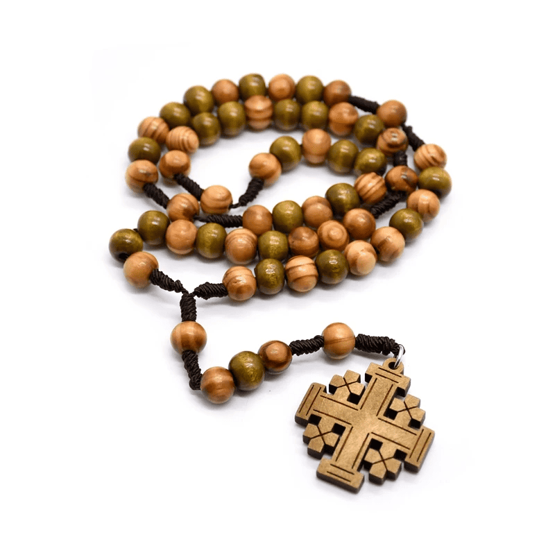 Este rosario está elaborado con cuentas de madera natural de 10 mm, cuidadosamente entrelazadas con cuerda resistente, evocando el estilo tradicional de los peregrinos de la Tierra Santa. Su cruz central expresa el sacrificio redentor y la esperanza viva, acompañando cada momento de oración o meditación.