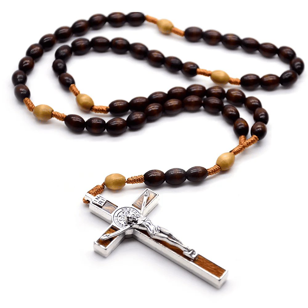 Este rosario está elaborado con cuentas de madera oscura, cuidadosamente trabajadas para reflejar la sobriedad y fortaleza espiritual de quien lo porta. Su diseño combina la calidez natural de la madera con detalles metálicos que aportan un acabado noble y atemporal, evocando momentos de oración serena y conexión interior.