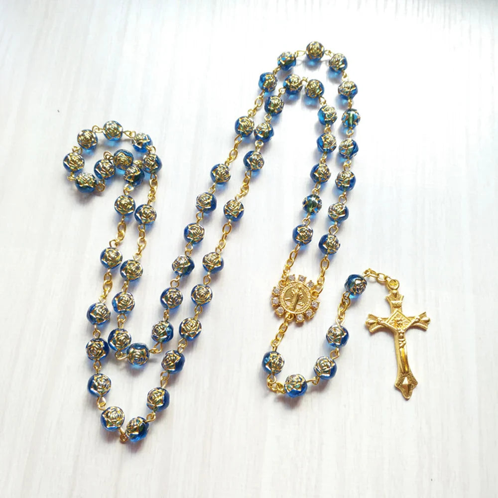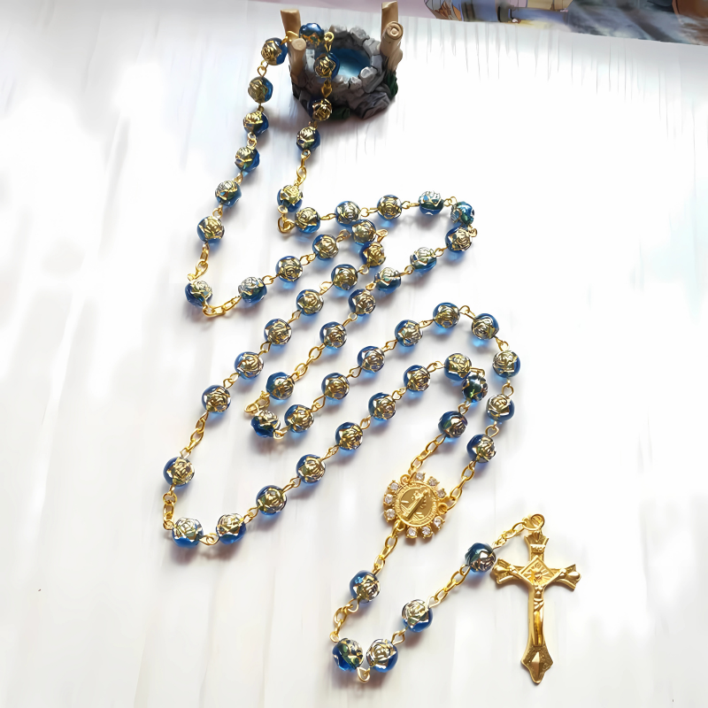 Este hermoso rosario combina la elegancia de las cuentas acrílicas azules con forma de rosa y el poder espiritual de la medalla de San Benito, junto a un crucifijo dorado tradicional con detalles ornamentales.