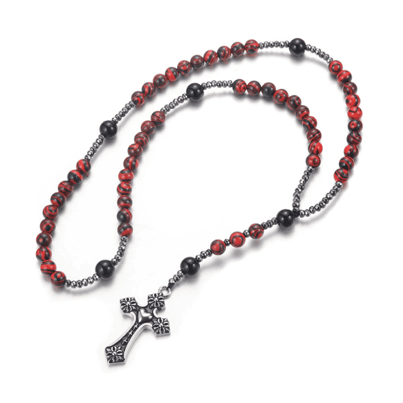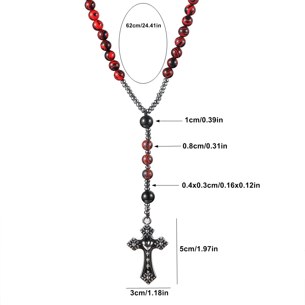 Este elegante collar tipo rosario, diseñado para hombres y mujeres, combina piedras rojas de 8 mm con vetas negras que representan la pasión y la energía espiritual.