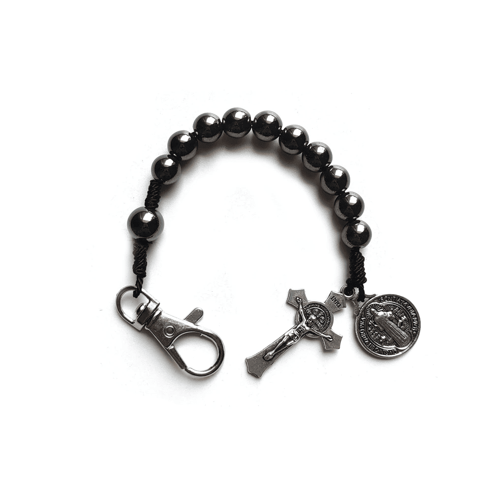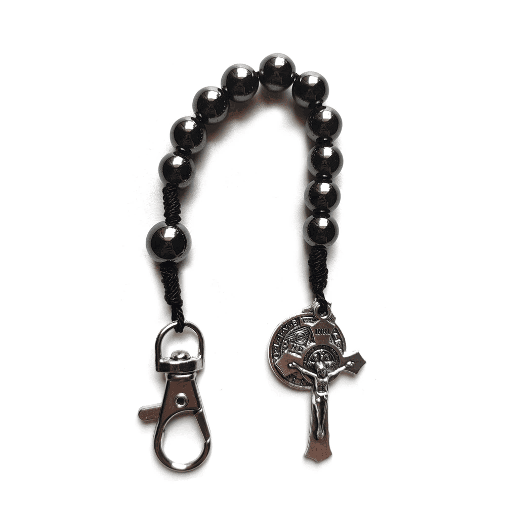 Lleva contigo un símbolo poderoso de fe y protección con este rosario de bolsillo diseñado con cuentas de hematita y la medalla de San Benito. Ideal para el día a día, el automóvil o en momentos de oración, este accesorio combina tradición religiosa y estilo moderno en una sola pieza. Su diseño compacto lo hace perfecto como amuleto personal o regalo espiritual para seres queridos.